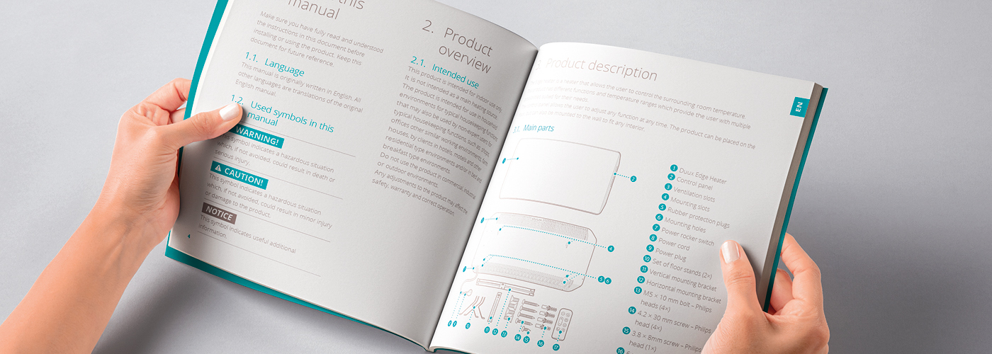 Elke handleiding wordt waar nodig ondersteund met illustraties en/of schema’s, natuurlijk geheel in uw huisstijl opgemaakt. In elke taal, volledig conform wet- en regelgeving. Geschikt voor print en online.
